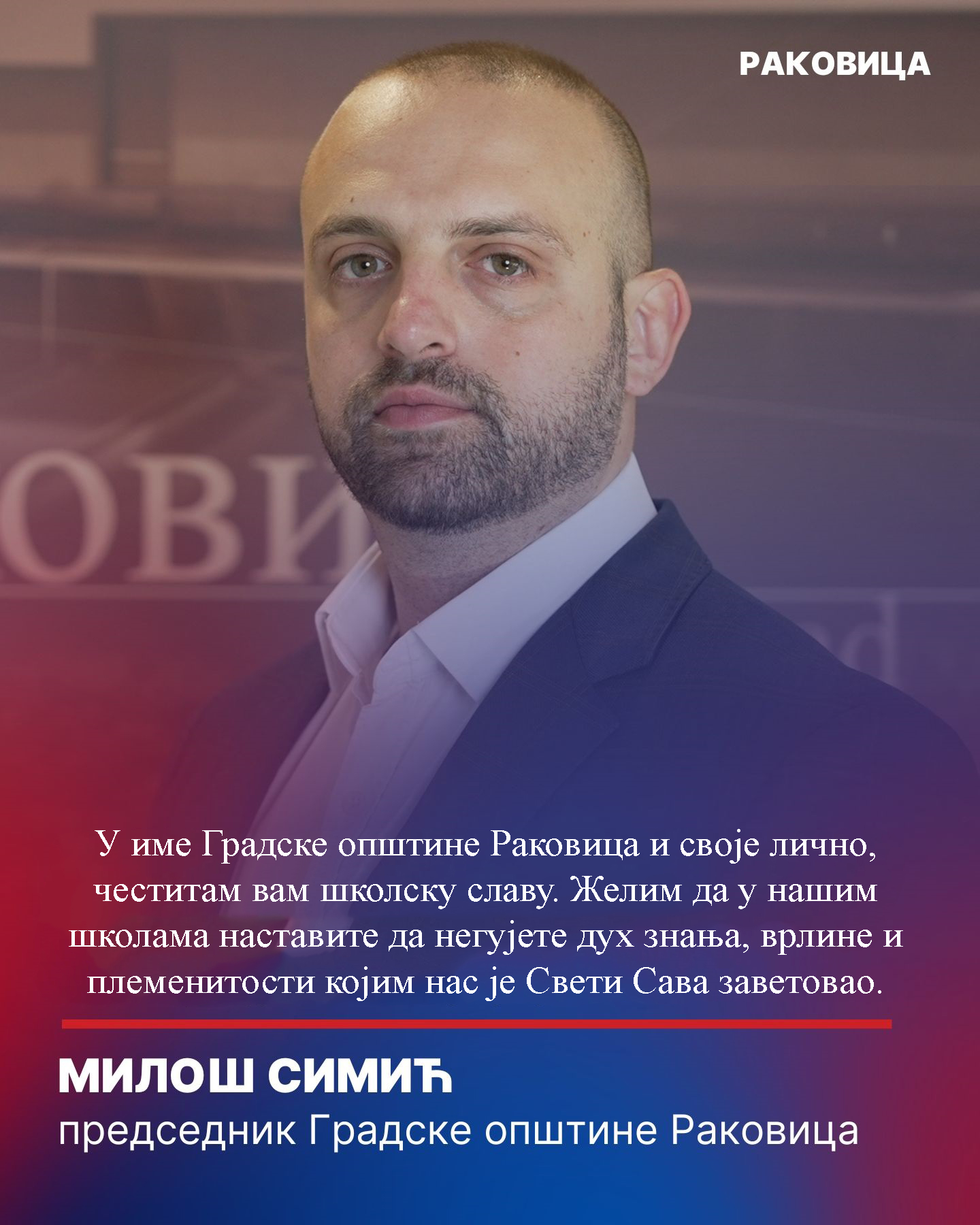 Поштовани суграђани, драги ученици, наставници и професори, Данас када славимо Светог Саву, нашег првог просветитеља и утемељивача цркве и државе, подсећамо се да је пут светосавља једини сигуран путоказ за наш народ. Тај пут нас је чувао кроз векове, а данас нам је потребнији него икада како бисмо очували свој идентитет и културу. У име Градске општине Раковица и своје лично, честитам вам школску славу. Желим да у нашим школама наставите да негујете дух знања, врлине и племенитости којим нас је Свети Сава заветoвao. Нека нам овај празник донесе здравље и снагу да заједно градимо бољу будућност за нашу децу. […]